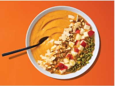 tastes amazing and really creates a creamy texture. This recipe is super easy with a small amount of ingredients. I really love the options of the toppings; these smoothie bowls just scream FALL!